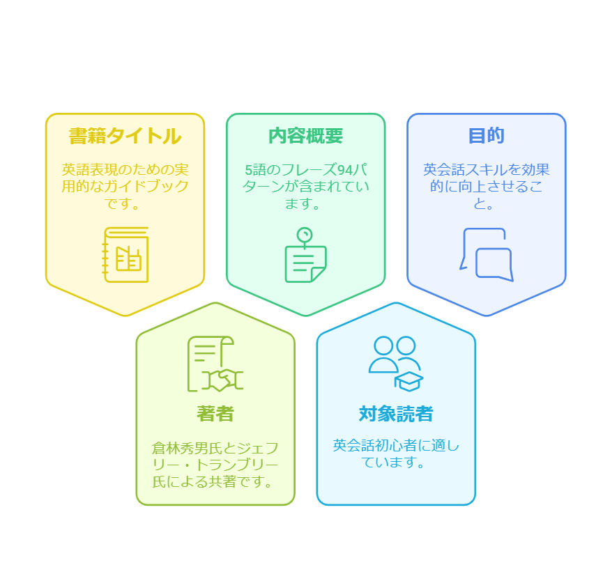 著者の倉林秀男氏とジェフリー・トランブリー氏が共著したこの書籍は、224ページにわたり、5語で完結する表現を中心に94パターンのフレーズが紹介されています。
