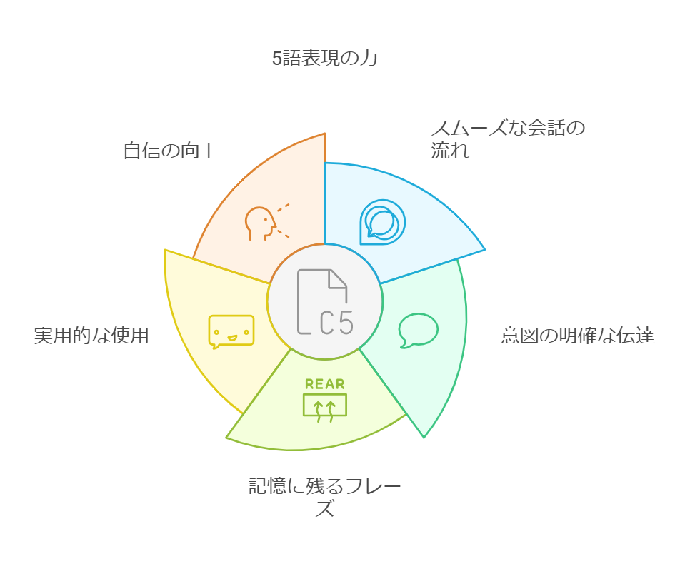 また、5語のフレーズは記憶に残りやすく、実際の会話で使いやすいという利点があります。