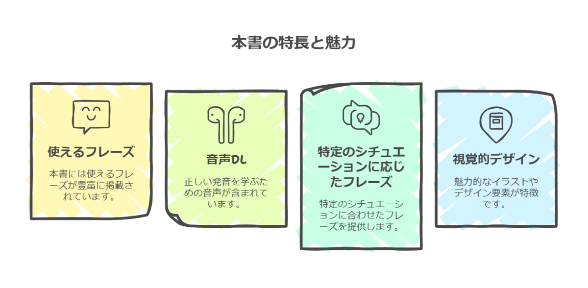 シンプルで使いやすいフレーズが中心にまとめられており、初心者でもすぐに使える内容になっています。
